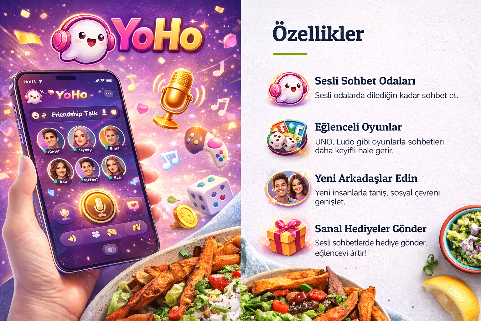 YoHo, kullanıcıların sesli sohbet odalarında bir araya gelerek yeni insanlarla tanışabildiği, eğlenceli vakit geçirebildiği ve sosyal etkileşim kurabildiği modern bir mobil uygulamadır. Yazı yazmadan, tamamen sesli iletişim üzerinden ilerlemesi sayesinde daha samimi ve doğal bir sohbet ortamı sunar. Oyunlar, sanal hediyeler ve ilgi alanına göre oluşturulan odalar ile kullanıcı deneyimini zenginleştirir. YoHo; evden sosyalleşmek isteyen, yeni arkadaşlıklar kurmayı seven ve dijital dünyada aktif olmak isteyen kullanıcılar için ideal bir platformdur.